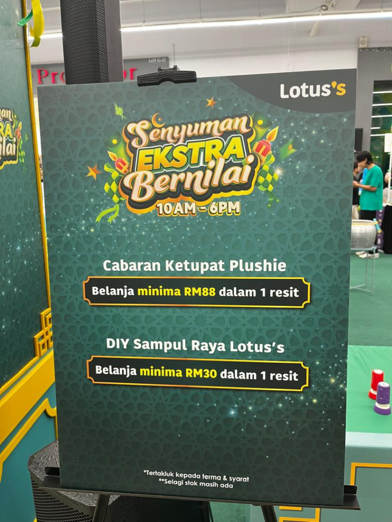 Kalau korang kunjungi Lotus’s yang ada booth permainan pula, jangan lupa sertai aktiviti yang Lotus’s sediakan macam buat sampul Raya DIY, main campak-campak ketupat, dan tangkap bola dan wind chamber.