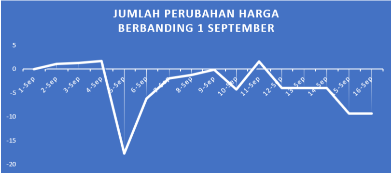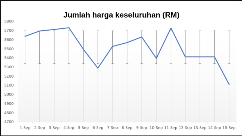 Jadi walaupun trend harga menaik dari 8 ke 9 September, sebenarnya ada kurang 4% dari hari biasa. Tapi penurunan terbesar yang kami nampak bukanlah pada 9 September, tapi 6 September! Pada tarikh ni, ada pengurangan harga keseluruhan sekitar 10% atau lebih RM555.