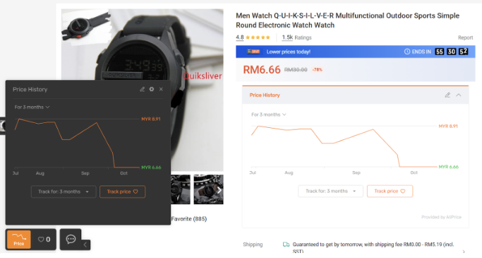 Salah satunya, guna extension AliPrice Shopping Assistant for Shopee untuk Google Chrome, yang boleh tunjuk sejarah harga sesuatu produk dan bagi notifikasi bila harga jatuh. Korang juga boleh bandingkan harga dengan laman e-dagang lain. Cara ni boleh bantu elak “fake discount”, iaitu bila harga dinaikkan seminggu sebelum sale dan kemudian diturunkan semula untuk nampak macam diskaun besar.