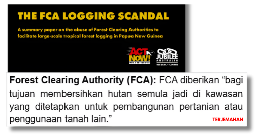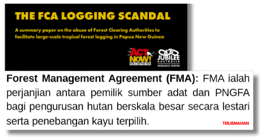 Mengikut laporan tu daripada 67 lesen Forest Clearing Authority (FCA) kat PNG, 65 daripadanya, iaitu 97%, dipegang oleh syarikat yang ada kaitan dengan Malaysia. Sama ada syarikat tu anak syarikat firma Malaysia, atau pengarah dan pemegang sahamnya orang Malaysia (atau duduk selesa kat Malaysia). Senang cerita, kalau kau baling dart kat peta PNG, besar kemungkinan dart tu kena hutan yang lesen pembalakannya milik orang Malaysia.