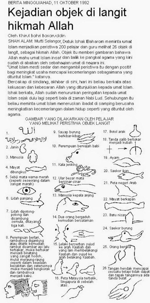 Hampir 25 tahun dahulu pada Oktober 1992, ada sekumpulan 200 orang pelajar dan guru-guru dari sekolah agama di Klang telah mendakwa dorang nampak beberapa objek aneh di langit. Bukan satu dua, tapi 26 buah secara keseluruhannya. Daripada bentuk janin bayi, mayat yang dikafankan dan beberapa lagi objek yang boleh buat korang kecut perut bila tengok.