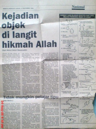 Laporan yang dorang keluarkan juga mengesahkan objek di langit itu hanyalah khayalan kumpulan pelajar sekolah agama hasil daripada pendewaan dorang terhadap sorang guru agama kat sekolah tu yang dipercayai menyebarkan ajaran sesat.