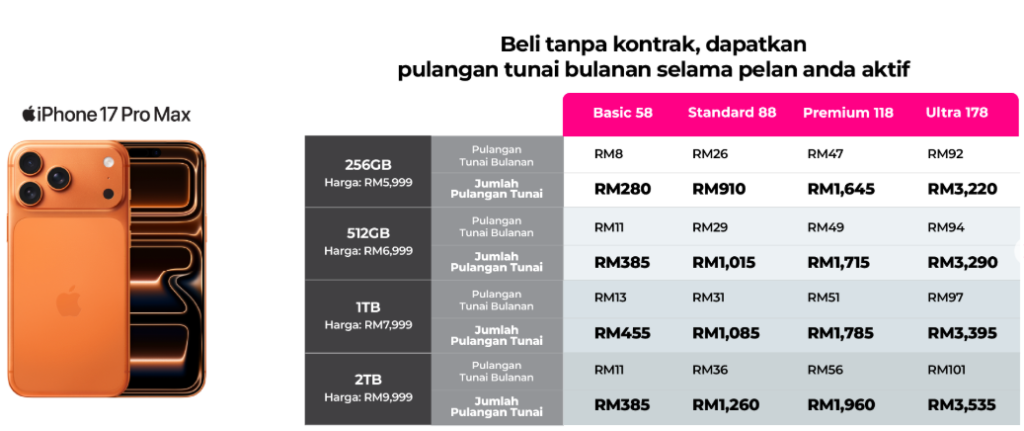 Dapatkan cashback bulanan untuk iPhone 17 Pro Max hingga RM3,535… tanpa sebarang kontrak!
